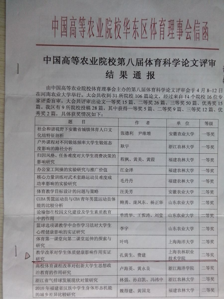 本届中国高等农业院校体育科学论文评选共征集到106篇,大会评选出一等奖15篇、二等奖26篇、三等奖50篇、多篇优秀奖。华东区有九所院校投稿28篇,其中获得一等奖5篇、二等奖9篇、三等奖12篇、优秀奖2篇。