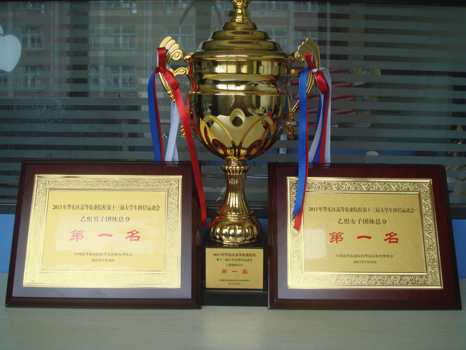 获得本次大赛男子团体第一名、女子团体第一名、男女团体第一名奖牌奖杯