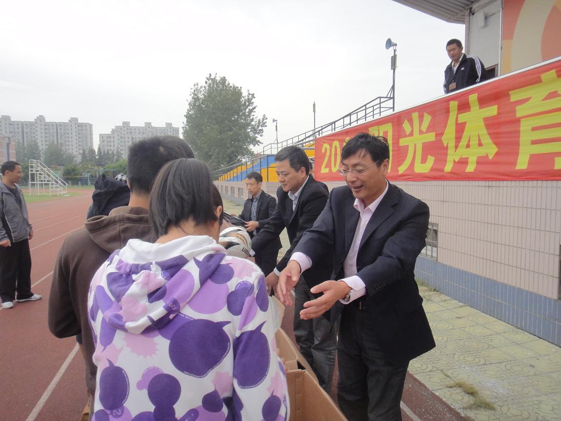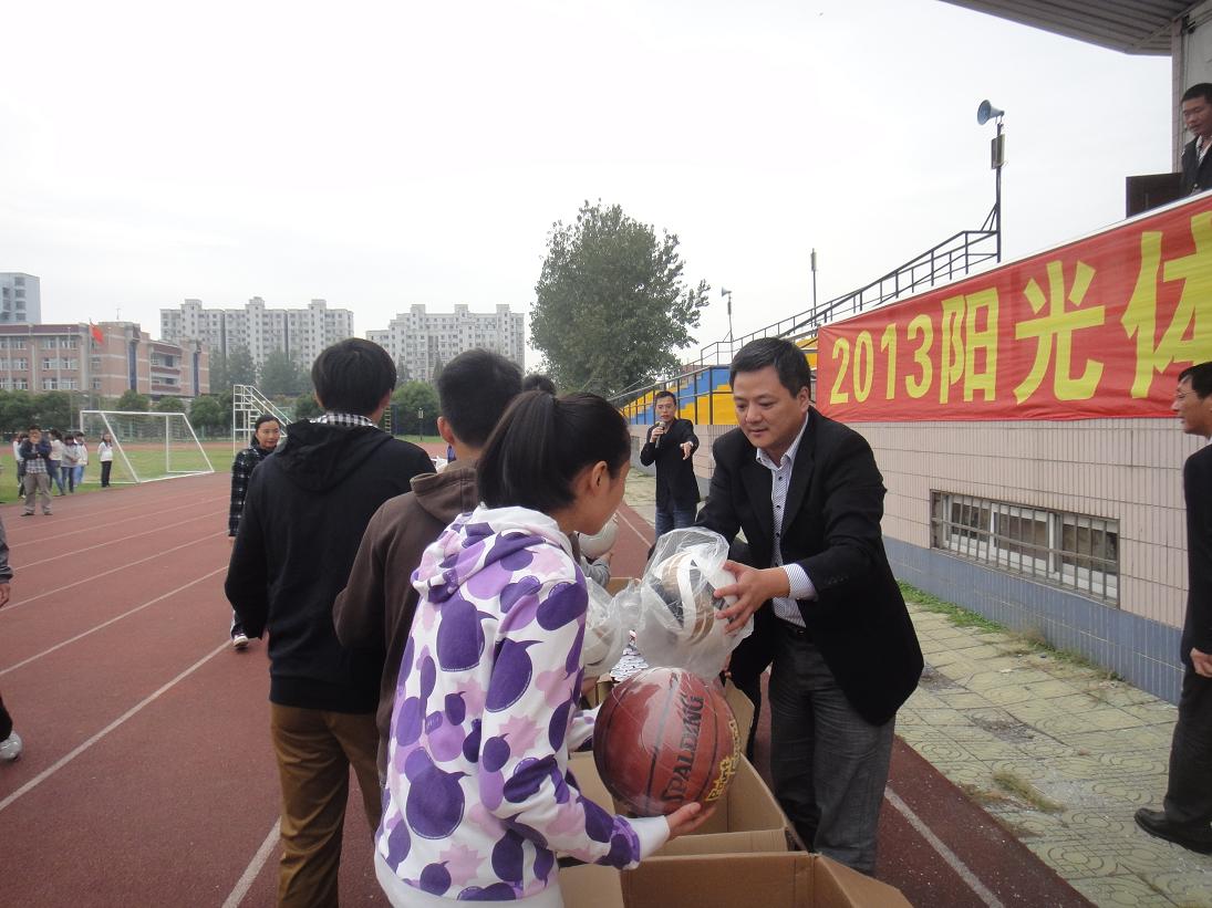 黄辉副校长也作了重要的发言,通过阳光体育活动的启动,希望同学们积极参与到运动中来,增加同学们的体质,培养集体主义观念和竞争合作意识,促进学校体育活动积极健康开展。为了此次活动的顺利进行,学校领导亲临现场为全体中专学生,发放体育运动器械(篮球、羽毛球拍、乒乓球拍、乒乓球等)。