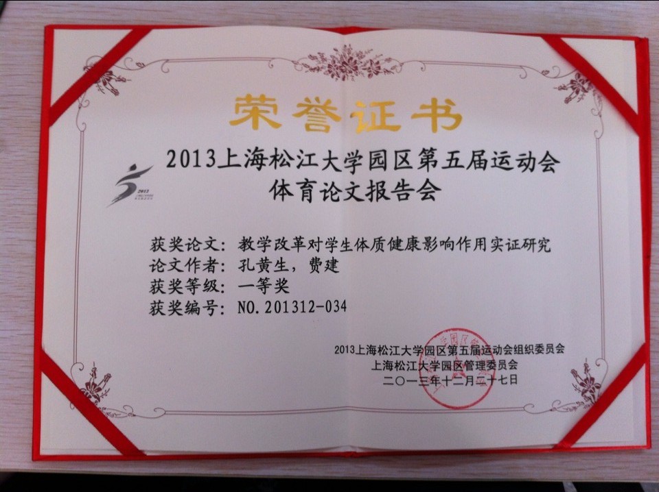 松江大学城第五届运动会闭幕式暨体育科学论文报告会上,我院孔黄生、费建老师的《教学改革对学生体质健康影响作用实证研究》论文在九所高校46篇科研论文中脱颖而出荣获“一等奖”。