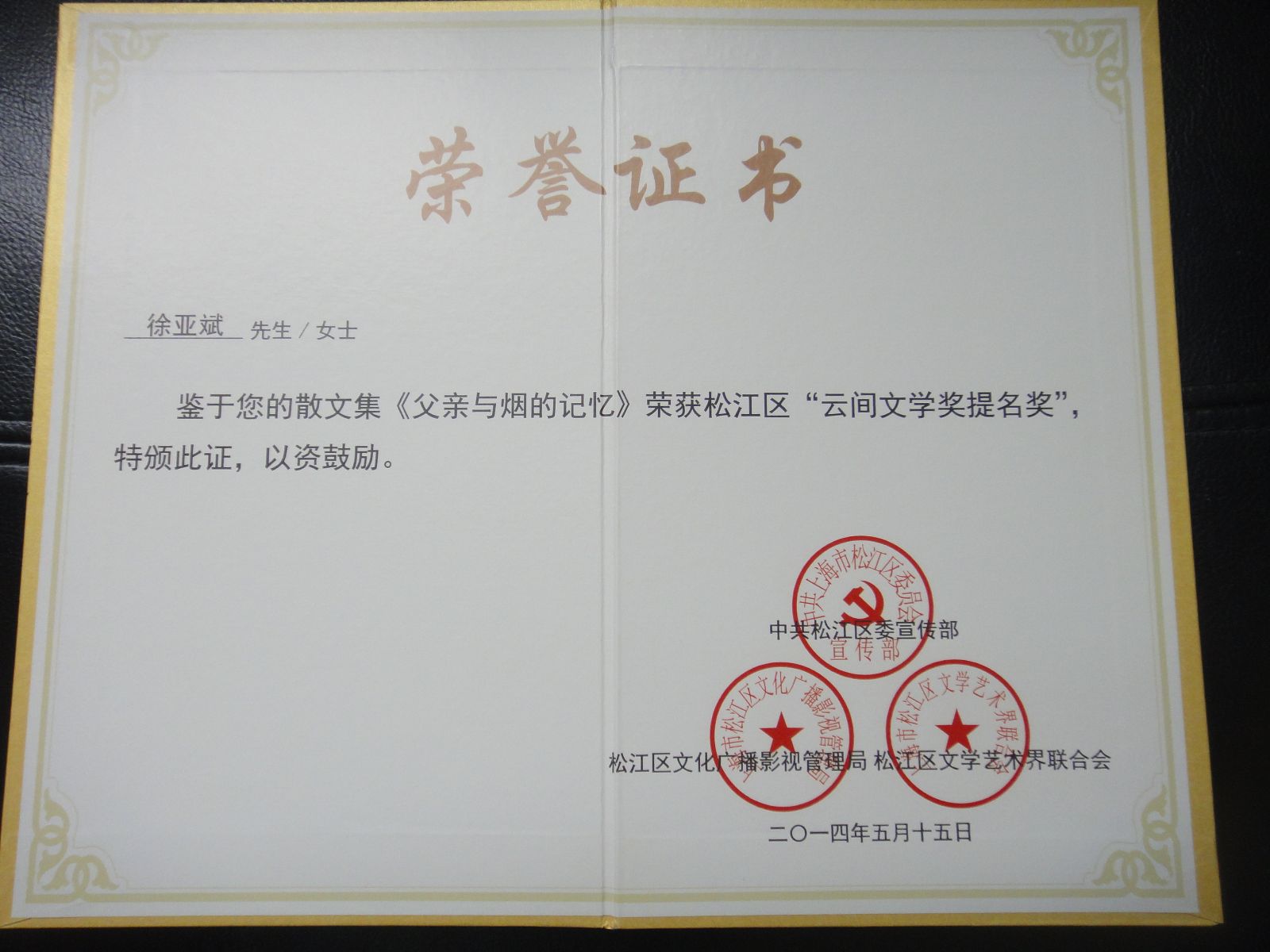近日传来喜讯,基础部教师徐亚斌的散文集《父亲与烟的记忆》荣获松江区“云间文学奖提名奖”。