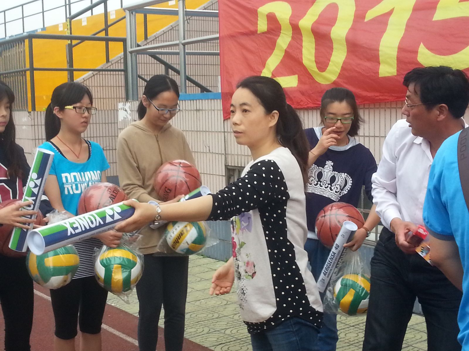仪式结束后,学院和学校领导给我校学生发放篮球、足球、排球、跳绳、毽子、乒乓球、乒乓拍、羽毛球、羽毛拍等一批运动器材。