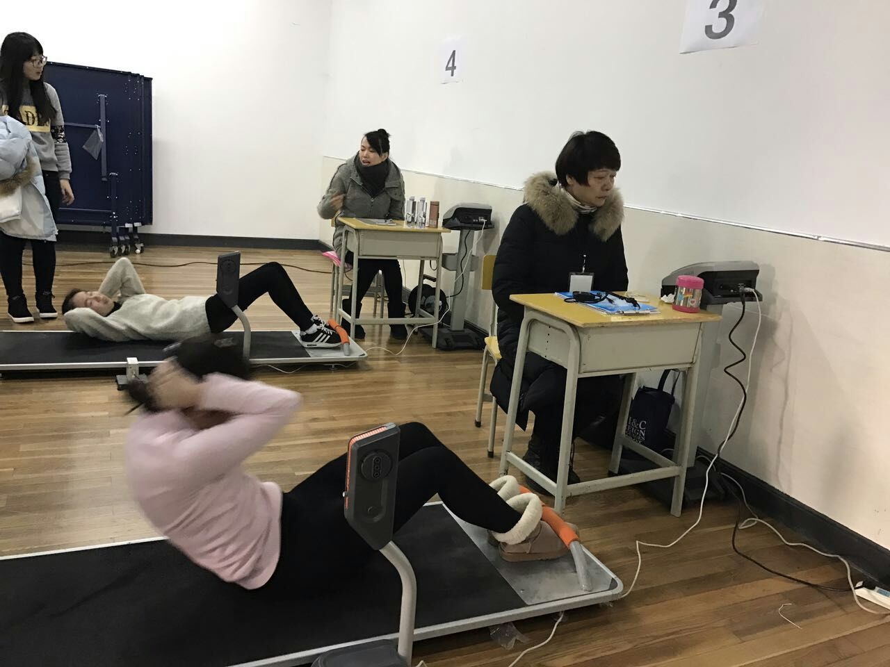 在测试前很多同学还是略显紧张,但在测试比赛现场,所有同学通过热身进行了十几分钟的身体活动后,渐入状态,顺利完成了引体向上、仰卧起坐、立定跳远、800米/1000米共4项的测试。