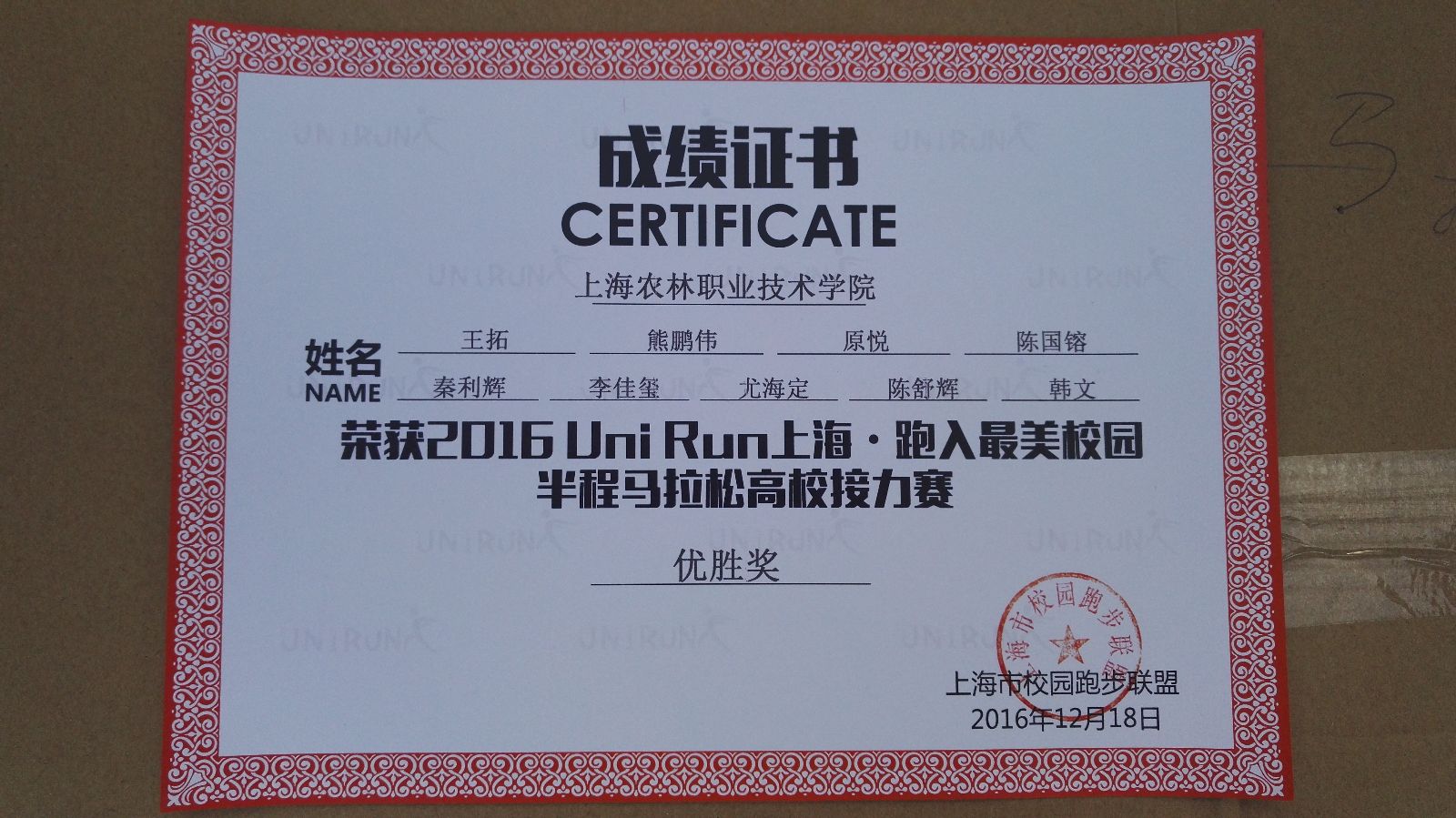 12月18日,学院9名学生在体育组孔黄生老师的带队下参加“斐讯杯”2016UniRun上海-跑入最美校园半程马拉松高校接力赛,荣获优胜奖。