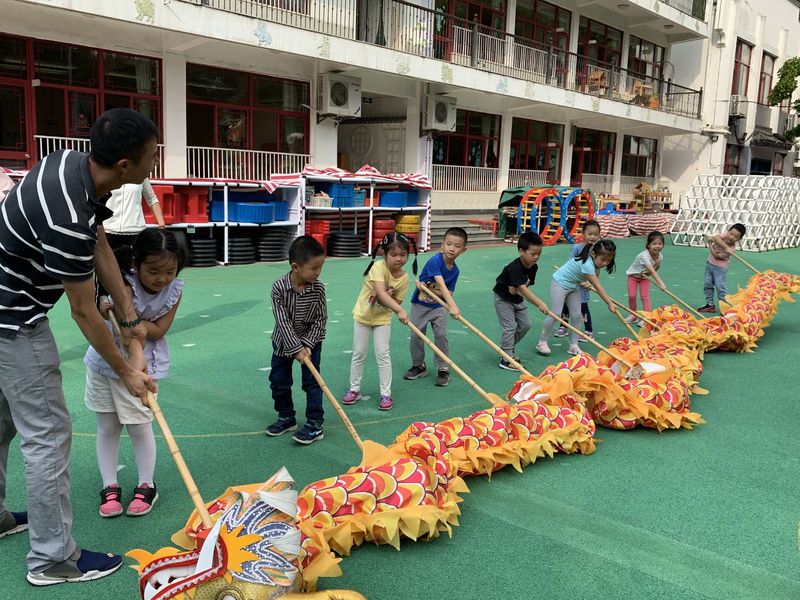 活动中,校舞龙队队员用饱满的热情,精湛的技能给机关幼儿园师生们带来了精彩的舞龙表演,孩子们深受感染,热情高涨;随后大班孩子们在孔黄生老师的指导下,观察龙头、龙身和龙尾结构,并在舞龙队员的帮助下,孩子们积极认真地练习左右摆臂、上下抖动等舞龙基本动作,让孩子们近距离感受中华传统文化的艺术魅力,激发幼儿对传统民族文化的热爱。