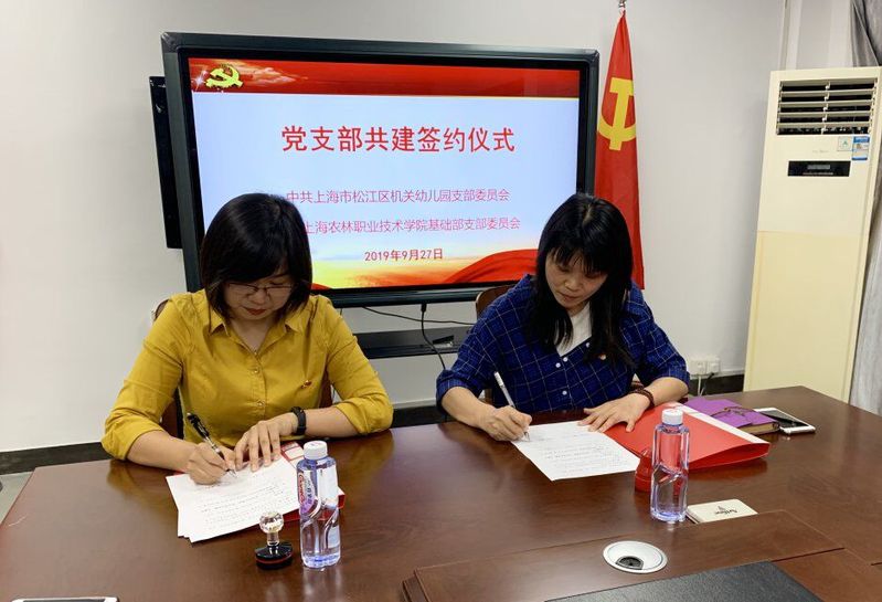 在共建仪式上,基础部党支部书记游小英与松江区机关幼儿园党支部书记计玲利分别就双方支部工作做了交流,对共建合作细节进行了充分商讨。双方将不定期共同开展党建活动,交流党建工作经验,努力构建“资源共享、互促发展”的基层党建工作新格局。游小英和计玲利分别代表两个支部签订了党支部共建协议。