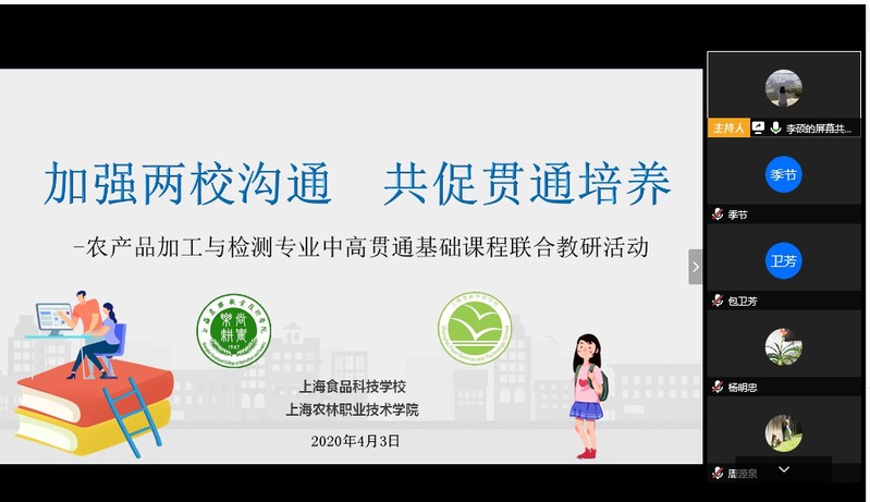 4月3日下午,市农校与上海食品科技学校,通过腾讯会议平台,开展了首次农产品加工与检测专业中高贯通基础课程联合教研活动。两校教务处领导及基础部相关教研室主任参加了本次教研活动。
