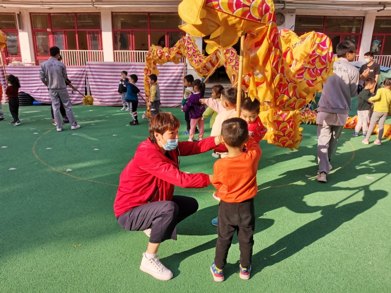 活动在精彩的舞龙表演中拉开帷幕,一条白龙在机关幼儿园腾飞,尤其是小朋友们零距离触摸到龙头、龙身时,激动得手舞足蹈,整个学校一片欢腾。基础部党支部书记孔黄生带领党员教师和舞龙队队员为小朋友们亲身示范,开展了一场别开生面的“舞龙”动作现场互动教学,激发孩子们学习舞龙的热情和兴趣。