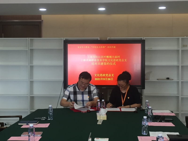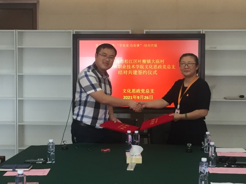 为落实党史学习教育成果,有效开展“我为群众办实事”活动,2021年9月26日,上海市松江区叶榭镇大庙村与我校文化思政党总支顺利举行结对共建签约仪式。