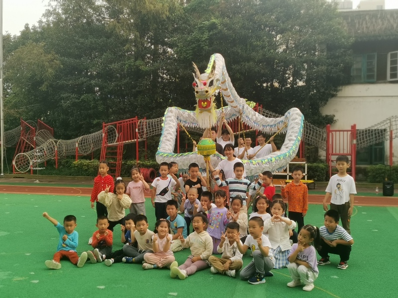 在活动开始之前,文化思政党总支袁少英老师向机关幼儿园的小朋友们介绍了赴园参加活动的老师和舞龙队学生,用贴近小朋友的话语抛砖引玉,介绍了中国传统的舞龙文化,让小朋友们对接下来的表演充满期待。活动在一片欢呼声中拉开帷幕,学院舞龙队学生跟随着激动人心的音乐节奏开始了精彩绝伦的舞龙表演。机关幼儿园大中小各班小朋友们在操场上围成一圈,用稚嫩的呼喊和响亮的掌声为舞龙表演叫好致谢。当学生们将长龙舞到小朋友们面前时,小朋友们激动地一个个摸了摸色彩鲜艳、栩栩如生的龙身,园内欢呼声、鼓掌声响彻云霄。随后,每个班级的小朋友们都兴奋地争相与舞龙队合影留念,小朋友们好奇地摸摸龙须、向舞龙队学生提出一些有趣的问题。舞龙队变幻多端、技艺高超的表演,小朋友们津津有味、不亦乐乎的观看,组成了一场“优秀传统文化传承”的盛宴。