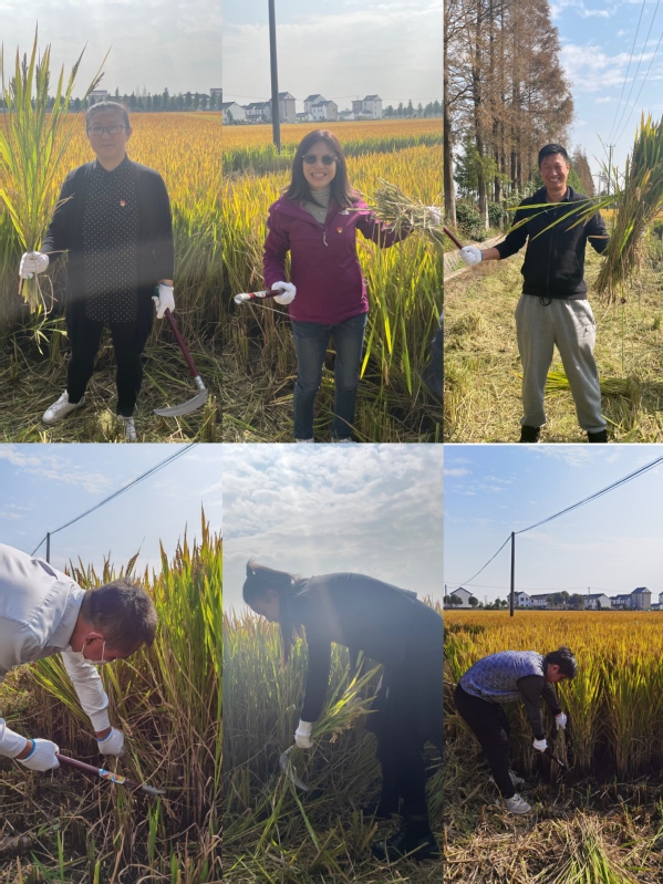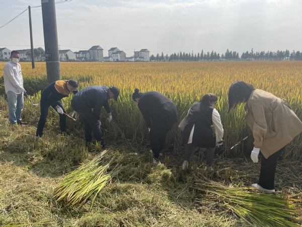 随后,在大庙村党总支的组织下,以“稻花香里说丰年,新时代中促振兴”为契机线索,大家走进大庙村农田基地,实际感受了一把农耕体验的乐趣,现场收割水稻,并观看了现代农用机械的收割过程。