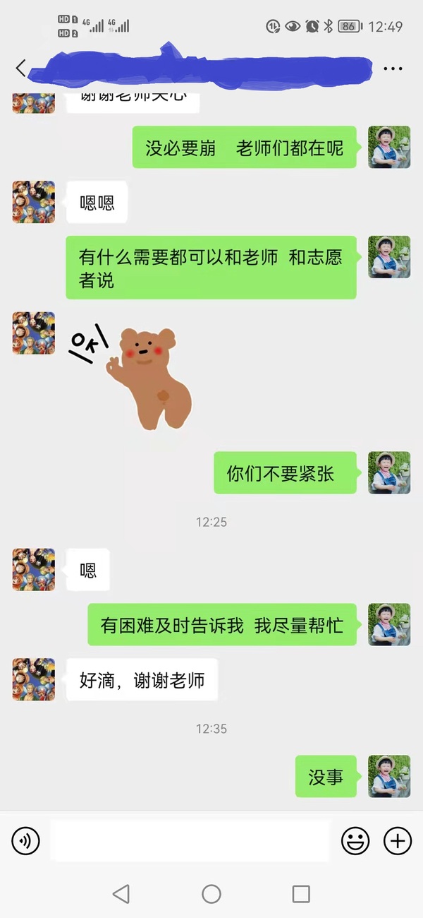 兼职班主任、辅导员在做好自己本职工作,参与志愿者的同时,下大力气管理班级,在符合疫情防控要求的前提下,通过视频、电话、深入班级面对面沟通等方式关心学生,和家长沟通,解决学生各种困难。刘培君、蒋文怡带的是中职生班级,面对未成年人他们每天数次巡查班级,深夜还在和学生视频,安抚学生想家的情绪;赵琳娜本人在基地隔离中,也通过电话、视频等方式保证班级管理不断档,还发挥专业优势开展了“线上拉歌”班级活动,鼓舞学生。