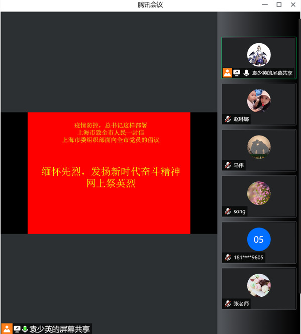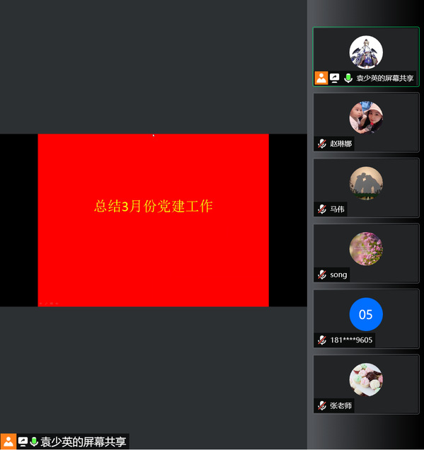 袁少英提示了下一阶段党建工作重点,引导大家集思广益,积极适应互联网+党建新模式,积极开发适合支部实际的新型工作模式。要求各党支部在4月份工作中继续抓紧、抓实、抓细防疫阻击战的各项工作,保障线上教学顺利开展,基于实际开展组织生活,持续推进党建和业务的深度融合。要落实每日统计上报党员参与防疫志愿者情况,要求先锋上海志愿者报道率达到100%,并鼓励大家,团结一致、共克时艰,我们一定会战胜病毒,迎来抗“疫”阻击战的胜利。