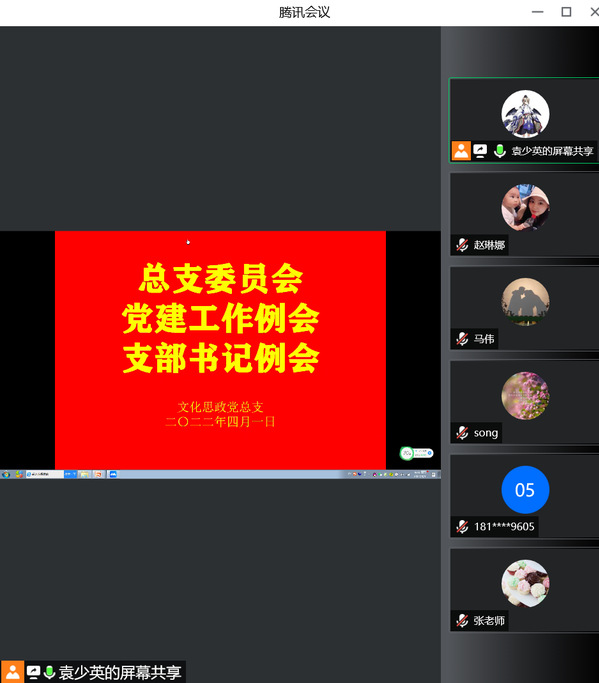 为进一步落实好疫情防控期间党务工作,4月1日上午9:00文化思政党总支开展线上总支工作例会,同时开展“网上祭英烈”活动。会议由党总支副书记袁少英主持,党支部书记、总支委员、组织员参会。