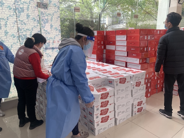 袁少英老师在居住的广富林街道松云水苑小区4月1日、4月3日两次参与居住社区保障民生物资发放。她和另一位志愿者统计好本楼的住户资料,去居委会领取政府统一采购的物资,一份一份分好,一户一户发放到住户手中。为了控制人员密度,减少接触,每栋楼只有两名志愿者,他们要负责几十户的物资发放,每户物资包括牛奶、方便面、蔬菜等,一份重十几斤。袁少英老师说,“作为党员这是应该的,能为大家做点事是最开心的。”