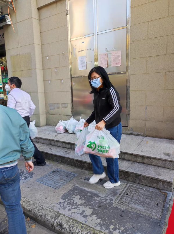 袁少英老师在居住的广富林街道松云水苑小区4月1日、4月3日两次参与居住社区保障民生物资发放。为了控制人员密度,减少接触,每栋楼只有两名志愿者,他们要负责几十户的物资发放,每户物资包括牛奶、方便面、蔬菜等,一份重十几斤。她说,“作为党员这是应该的,能为大家做点事是最开心的。”蒋文怡老师4月1日、2日、4日、5日连续四天作为所在社区松江区永丰街道百合苑居民区的志愿者,多次参加了社区全员核酸检测辅助工作、社区巡逻监督等工作。她说,“防疫工作,人人有责,能作为志愿者为我的“家园”做出一些贡献,我感到非常荣幸。”耿燕霞老师作为广富林街道上尚缘居民区志愿者,协助社区工作人员进行抗原自测材料的分发、解释、登记、回收等工作。她说,“一天下来,虽然感觉身体很累,但心情很愉悦,满满的幸福感和获得感。”