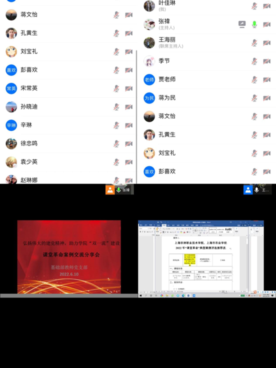 为进一步提升教师的课堂教学基本能力,推进三教改革,落实三圈三全十育人,6月10日晚,基础部教师党支部通过腾讯会议的视频形式开展了以“课堂革命案例交流”为题的主题党日活动。此次活动特邀学院农经系王海丽老师为大家做优秀案例分享,全体党员参加。会议由基础部教师党支部副书记张禕主持,全体党员参加。