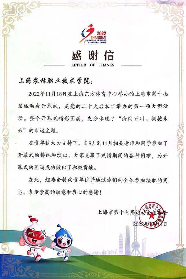 近日,学校收到了上海市第十七届运动会组委会发来的感谢信,对我校相关老师和同学克服疫情困难,参加开幕式的排练和演出的大力支持表示诚挚的谢意。