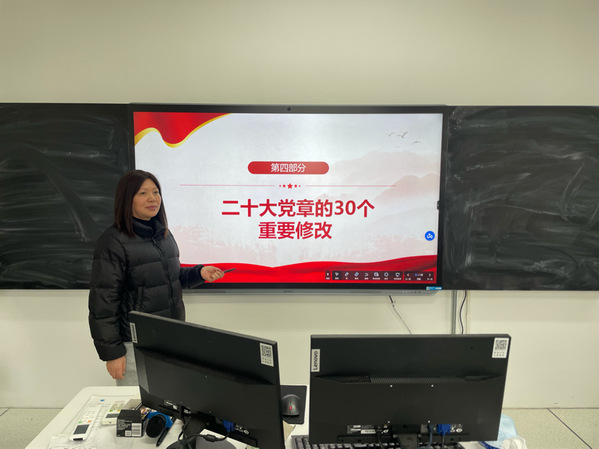 袁少英介绍了学习新《党章》的重要性和必要性,并由基础部教师党支部书记辛琳与思政课教师党支部书记马伟分别从“为什么要修改党章”“总纲部分的修改”“条文部分的修改”三个主题,组织各自支部党员学习,重点介绍、且详尽梳理了新《党章》的创新要点。