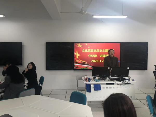 为深入学习党的二十大精神和中央纪委二次全会精神,文化思政党总支3月24日下午,在综合楼306语音室开展“守纪律、讲规矩”主题党日活动。活动由党总支书记袁少英主持,全体党员参加。