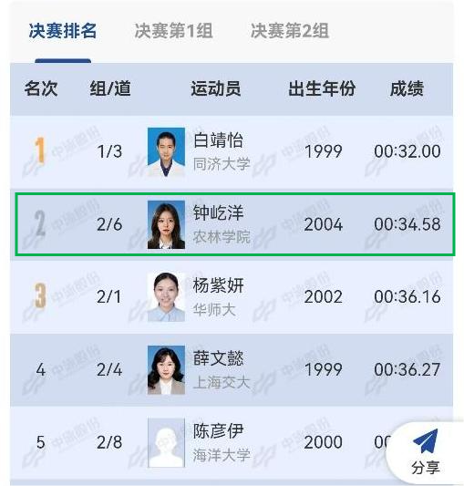 本次比赛由上海市教育委员会主办、上海市大学生体育协会和上海交通大学承办,来自全市25家高校共计295名运动员参加,竞争非常激烈。面对众多高手,钟屹洋同学毫不畏惧,充分发挥备赛训练成果,比赛中奋力拼搏,最终在女子甲组50米蝶泳和100米蛙泳两项比赛中,分别以34.58秒和1分36秒的成绩,获得亚军和季军。