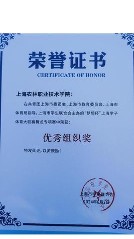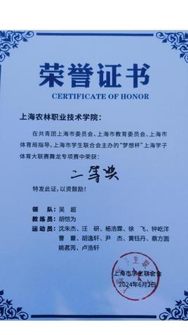 2024年6月2日,由共青团上海市委员会、上海市教育委员会、上海市体育局指导,上海市学生联合会主办的“梦想杯”上海学子体育大联赛舞龙专项赛在上海城建学院举行。我校由沈朱杰等十二名同学组成的舞龙队在与上海其他高校20支代表队、260余名参赛人员的同台竞技中赢得二等奖,学校同时获优秀组织奖。