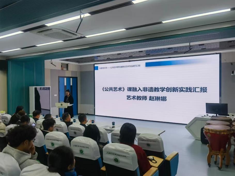 学院公共艺术课负责人、非遗教学指导教师赵琳娜以“非遗与科学——《公共艺术》课融入非遗教学创新实践”为题进行了详细工作汇报。