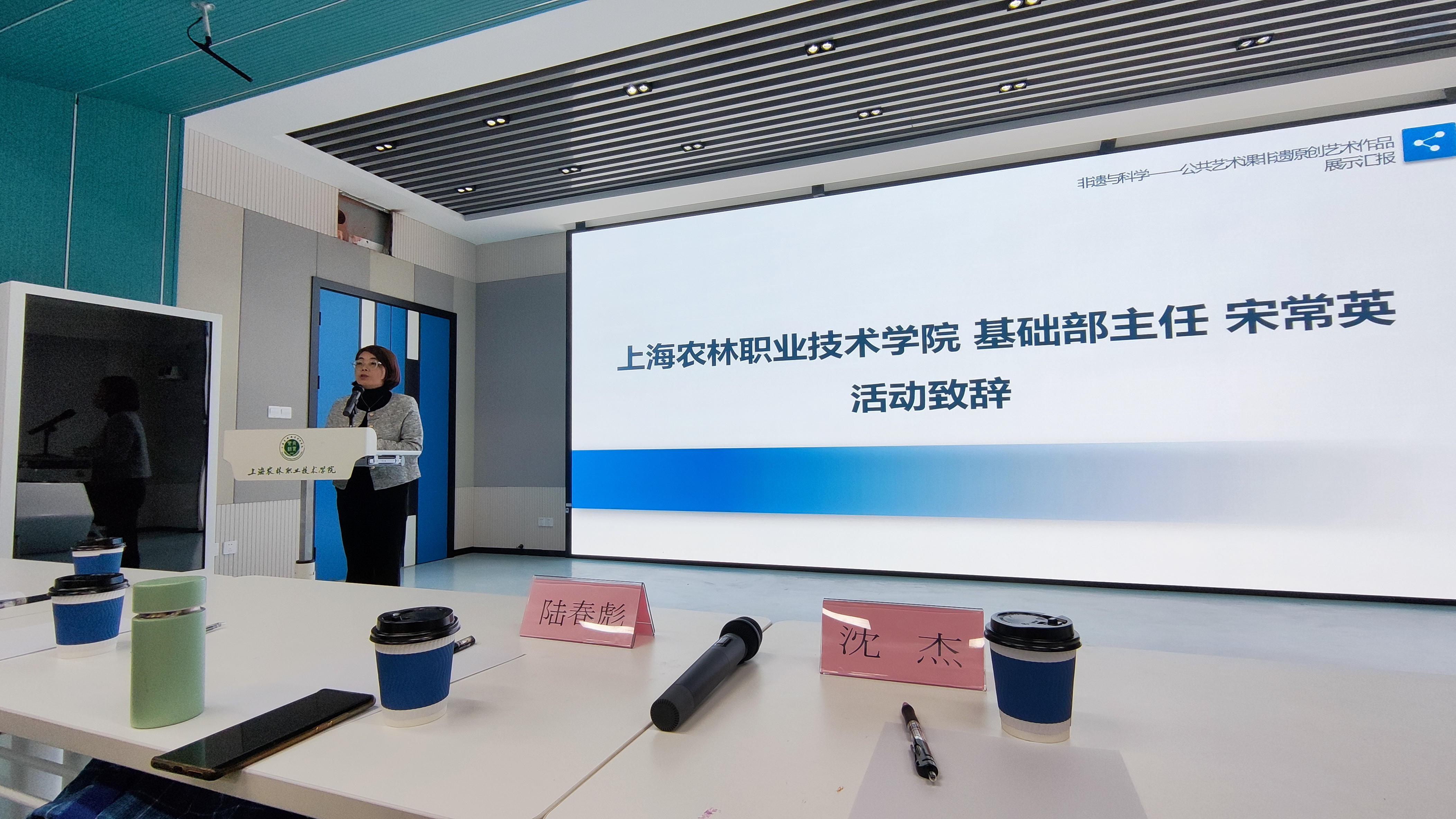 为展示近期我院学生艺术学科创新成果,12月27日下午,基础部主办开展了公共艺术课非遗原创艺术作品展示汇报活动。活动特邀松江区文联驻会副主席陆春彪、上海市非遗田山歌传承人沈杰参加,学院院办主任费明、基础部主任宋常英、文化思政党总支书记李杰及第三十七届“上农之春”科技文化节非遗艺术技能云比赛获奖学生代表参加了本次活动。