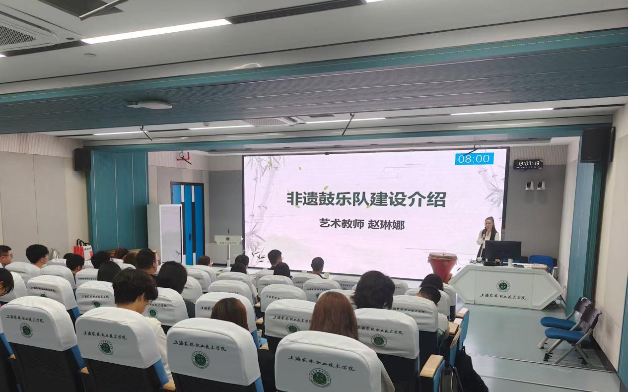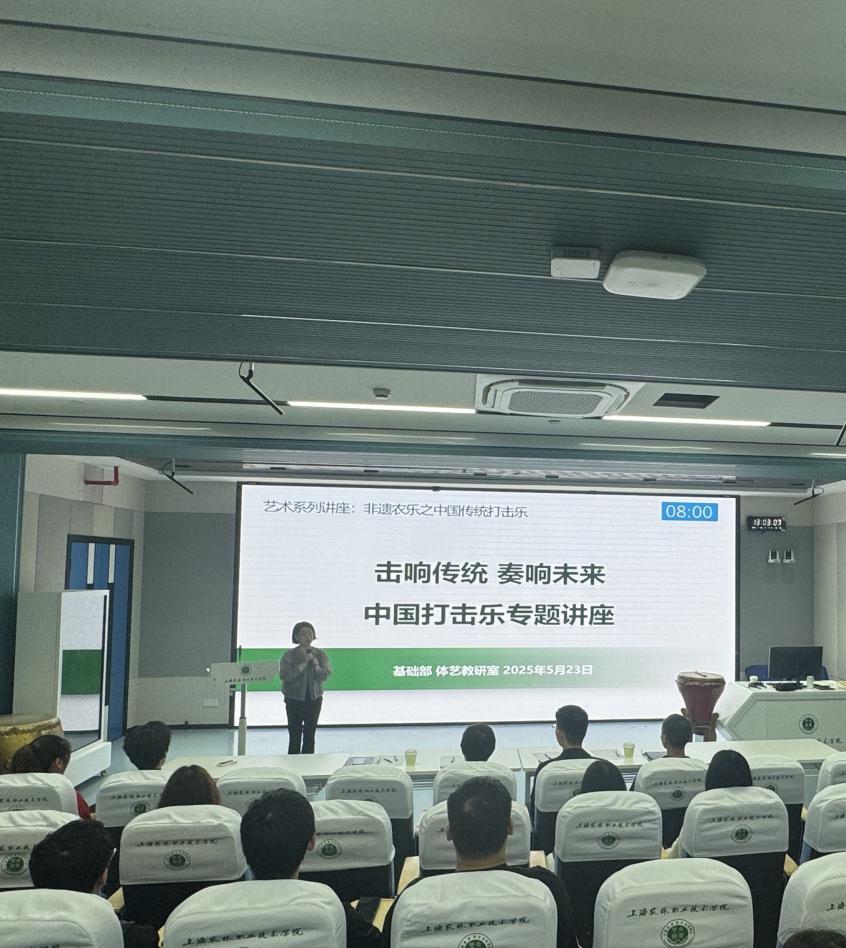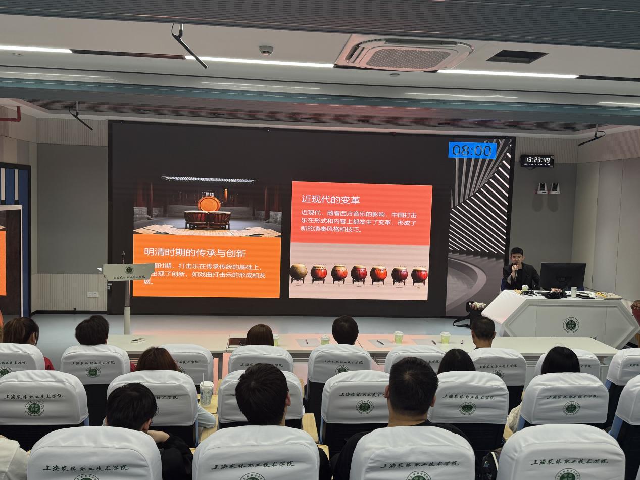 为大力弘扬中华优秀传统文化,推动非遗鼓乐的传承与创新,进一步提升学生对传统文化艺术的认知,5月23日基础部举办了“击响传统 奏响未来”中国打击乐专题讲座。本次活动特邀青年演奏家张粼枫担任主讲。学院党办院办主任费明、基础部主任宋常英、支部书记孔黄生与学生代表共同参与了本次活动,活动由艺术课教师赵琳娜主持。