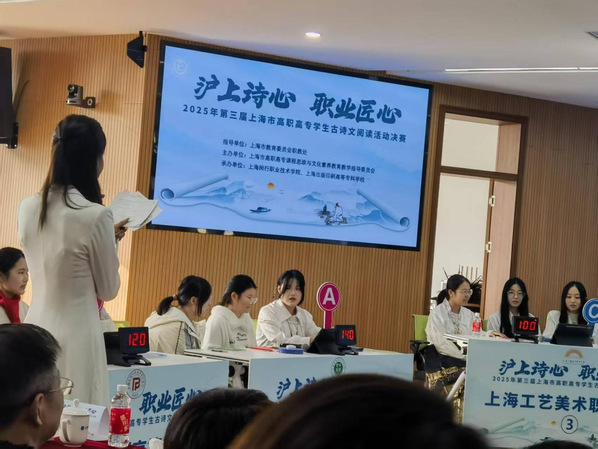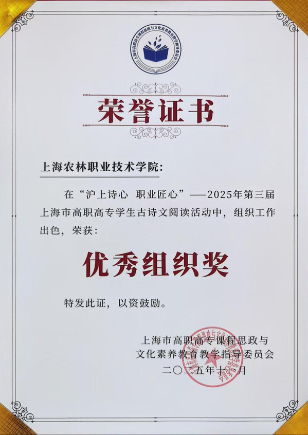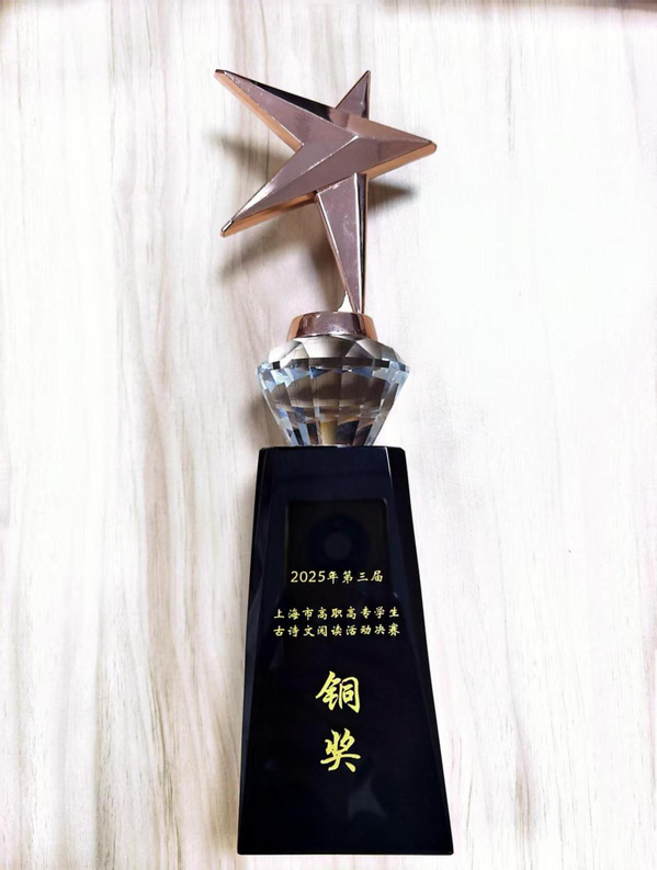 11月28日,由上海市高职高专课程思政与文化素养教育教学指导委员会主办的“沪上诗心,职业匠心——2025年第三届上海市高职高专学生古诗文阅读活动”圆满落幕。在竞争激烈的决赛中,由我院5名学生组成的代表队发挥出色,最终荣获团体三等奖。同时,学院凭借出色的组织工作获评“优秀组织奖”,指导教师团队荣获“优秀指导教师奖”。这是我院首次在该项目中进入决赛并获奖。