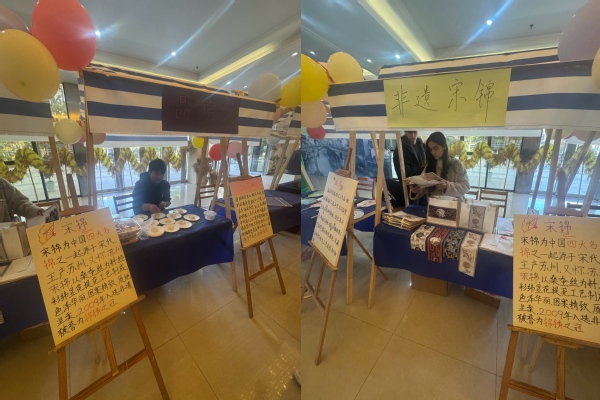互动体验环节中,学生们现场演示非遗技艺,松江老布锦囊制作、宋锦包制作、金山莲香糕与叶榭青龙饺制作,邀请师生动手参与,让大家在亲身体验中深刻感受非遗的独特魅力。